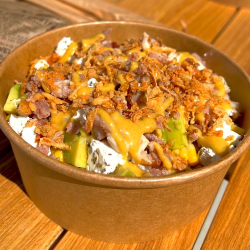 La fritade c'est un délicieux plat composé d'une base de frites de patates douces agrémentés de plusieurs ingrédients au choix (légumes, viandes, poissons, fromages...) ainsi que de sauces et toppings !