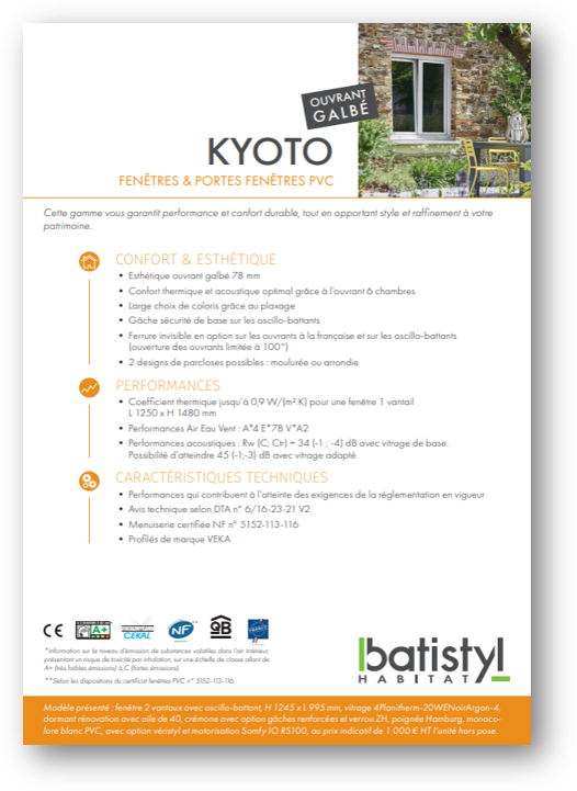 Les fenêtres et portes-fenêtres PVC Kyoto s’adaptent aussi bien aux projets de rénovation qu’aux projets neufs avec ses 2 designs disponibles : droit ou galbé. Notre gamme de menuiseries PVC est idéale pour améliorer l’isolation générale de votre habitat grâce à ses performances thermiques remarquables tout en maîtrisant votre budget. Personnalisez vos fenêtres avec un large choix d’options et de coloris pour les harmoniser avec le style de votre logement. Faciles d’entretien et robustes, elles vous garantissent performances élevées et longévité.
