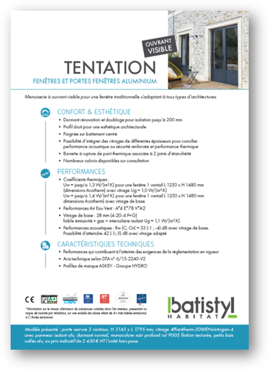 Grâce à leurs lignes épurées et à la finesse de leurs profils, les fenêtres et portes-fenêtres aluminium Tentation sont idéales pour les réalisations contemporaines. La conception en ouvrant caché met l’accent sur l’apport solaire en optimisant la surface vitrée, vous permettant de profiter des bienfaits de la lumière naturelle dans votre intérieur. L’esthétique à ouvrant visible est plus traditionnelle et apporte du charme à votre maison, notamment dans le cadre d’un projet de rénovation. L’aluminium est un matériau élégant et design, ajoutez à cela un large choix de coloris, de poignées, de vitrages et d’options et vous obtiendrez une menuiserie épousant parfaitement l’architecture de votre habitat tout en répondant à vos besoins. Grâce aux caractéristiques de l’aluminium, les fenêtres Tentation sont résistantes et durables.