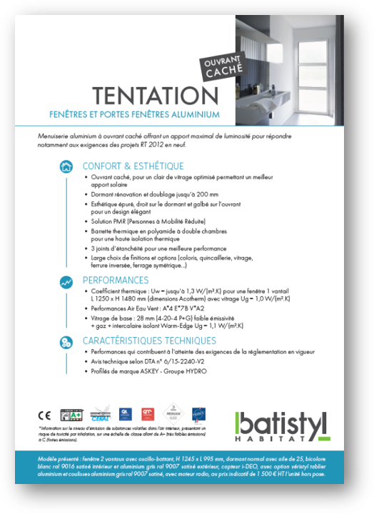 Grâce à leurs lignes épurées et à la finesse de leurs profils, les fenêtres et portes-fenêtres aluminium Tentation sont idéales pour les réalisations contemporaines. La conception en ouvrant caché met l’accent sur l’apport solaire en optimisant la surface vitrée, vous permettant de profiter des bienfaits de la lumière naturelle dans votre intérieur. L’esthétique à ouvrant visible est plus traditionnelle et apporte du charme à votre maison, notamment dans le cadre d’un projet de rénovation. L’aluminium est un matériau élégant et design, ajoutez à cela un large choix de coloris, de poignées, de vitrages et d’options et vous obtiendrez une menuiserie épousant parfaitement l’architecture de votre habitat tout en répondant à vos besoins. Grâce aux caractéristiques de l’aluminium, les fenêtres Tentation sont résistantes et durables.